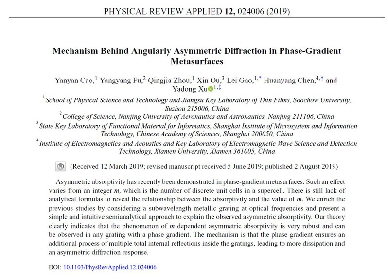 苏州大学博士研究生曹燕燕同学和原苏州大学博士生、现南京航空航天大学的伏洋洋副研究员为论文的共同第一作者。Physical Review Applied是物理类期刊中少数1区期刊之一,是美国物理协会(APS)旗下唯一应用物理综合性期刊,与Physical Review Letters定位互补。