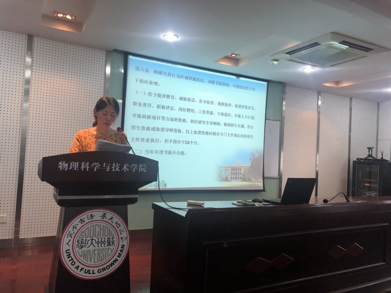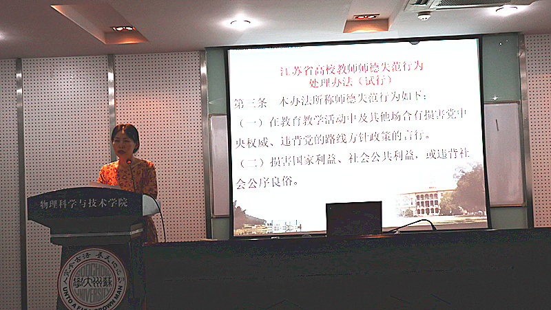 接着孙德芬书记向全院教师传达了江涌书记在校党委十二届八次全体会议的讲话精神,并通报了学院党委2019年下半年的工作计划,主要有:开展“不忘初心、牢记使命”主题教育、《习近平新时代中国特色社会主义思想学习纲要》的学习、组织师生参加学校举办的“我和我的祖国”大合唱比赛、开展《新时代江苏高校党支部建设“提质增效”三年行动计划》工作、大学物理党支部申报教育部“样板党支部”、加强党风廉政建设和干部队伍建设、加强统一战线、工会、团委、学生会、研究生会、退休老教师工作等方面。随后,孙书记带领全体教师认真学习了《江苏省高校教师师德失范行为处理办法(试行)》,要求全体教师加强师德师风建设,严守职业道德,坚持育人为本不动摇、落实立德树人根本任务,提高人才培养质量。