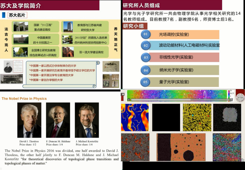 为给予全国各高校优秀大学生了解苏州大学物理科学与技术学院以及物理学科前沿领域的机会,学院于2020年7月11日-7月12日利用腾讯平台线上举办了2020年度暑期夏令营活动。研究生院曹健院长、学院党委书记孙德芬、院长高雷及学院其他党政班子成员、系部所主任及教授代表参加了开营式。开营式由杭志宏教授主持。