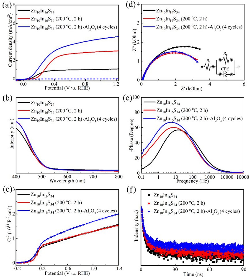 苏州大学李亮课题组使用水热方法首次合成Zn10In16S34超薄纳米片,使用简单的低温热处理方式,在光电极中同时引入空位(Zn和S)和掺杂(O),提高了光电极的载流子分离能力,减少了体相符合,增加了载流子浓度,延长了载流子的寿命,使得表面阻抗大大降低,从而有效提升了光电化学性能(Figure 1)。具体来说,通过对Zn10In16S34超薄纳米片在空气中不同温度的热处理,高温下,O以氧化物的形式存在,低温下O以掺杂的形式存在;在最佳温度条件下,对热处理的时间进行调控,随着时间的变化,其O掺杂的量逐渐发生变化,另外通过对其最佳热处理条件的样品进行XPS刻蚀处理发现Zn和S强度随着刻蚀深度增加逐渐增加,证明此时Zn和S空位在光电极表面的形成。进一步通过原子层沉积技术制备一层超薄Al2O3用来消除表面缺陷态,进一步提升光电极性能,最终使得光电流提升4.7倍,并且大大降低了起始电压。DFT理论计算表面O-掺杂过高或者过低均不利于性能的提升,其掺杂浓度需要一个适中量。另外,Zn空位和S空位以及O-掺杂大大降低了反应过电势,协同导致光催化分解水性能的提升。