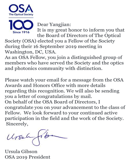 近日美国光学学会(OSA)正式发来贺信,国家杰出青年科学基金获得者、物理科学与技术学院蔡阳健教授在2019年美国光学学会理事大会中当选为美国光学学会(OSA)会士(Fellow)。