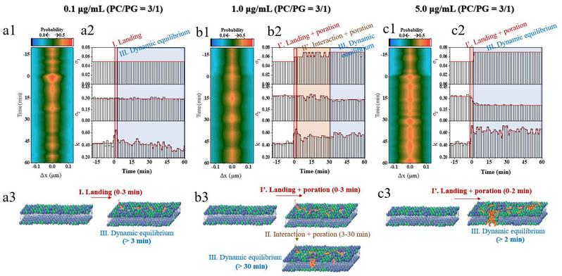 如何解析细胞膜的界面作用机制是细胞生物物理研究中的一大挑战,这一方面的研究对理解细胞的诸多生命过程具有重要意义。苏州大学物理科学与技术学院杨恺教授与松山湖材料实验室元冰研究员合作,发展了一种“高斯分类法”,可用于定量分析脂质与蛋白或多肽的全时空相互作用过程,尤其是膜界面过程中脂质分子扩散运动的时间—空间异质性,相关结果以“Non-Gaussian Diffusion of Individual Lipids Unveils the Unique Peptide−Membrane Interaction Dynamics” 为题发表在《J Phys Chem Lett》杂志。