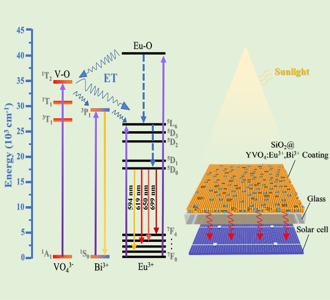 光谱下转换技术是拓宽晶硅太阳电池光谱响应范围,提高其光学性能的重要手段。而如何将下转换纳米材料与光伏电池或组件有机结合是转光技术在商业化光伏产品上是否能够真正应用的关键点。近日,我院苏晓东教授团队在下转换纳米材料与光伏玻璃减反层有机结合方面上取得了新的研究成果。本工作提出一种在光伏玻璃减反层原位生成下转换纳米材料的思路,通过将下转换纳米材料前驱体溶液与商用二氧化硅镀膜液结合,制备出兼具减反和下转换双功能的二氧化硅涂层。通过工艺优化,该双功能涂层较纯SiO2涂层,玻璃透射率得到了明显提升。将最优条件的双功能涂层玻璃应用于TOPCon电池,电池的光电转换效率较覆盖纯SiO2涂层玻璃时提高了0.18%。另外,将该涂层应用于对紫外较为敏感的HJT电池,电池在30 kWh紫外辐照量下的紫外衰减(UVID)百分比值下降约0.62%。