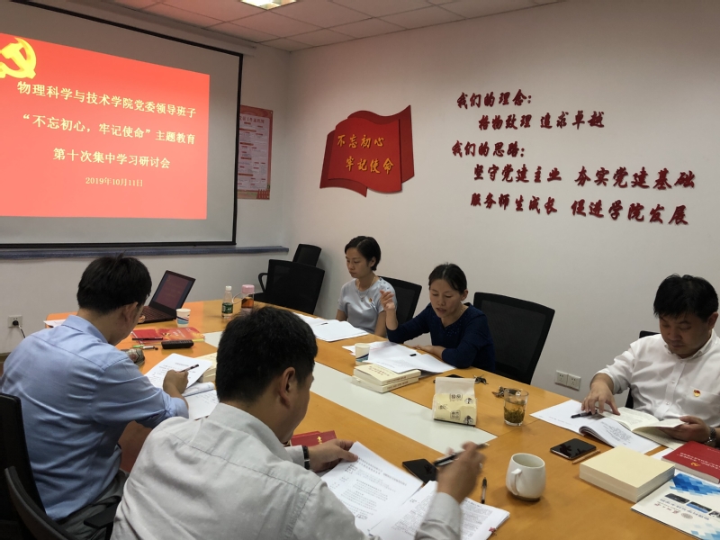 10月11日晚上,物理科学与技术学院党委领导班子在博习楼213会议室召开了“不忘初心、牢记使命”主题教育第十次集中学习研讨会,学院党政领导班子全体成员出席了会议,此次学习的主题是“学习党章党规、对标对表找差距”。