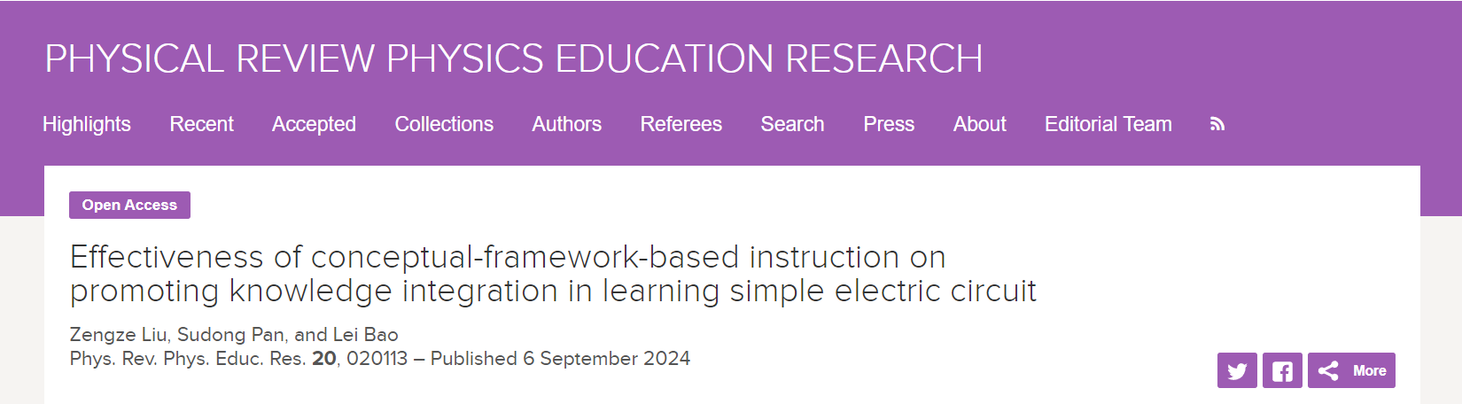 苏州大学物理科学与学院物理教育研究所刘增泽博士以苏州大学第一署名单位在国际“物理教育”顶刊PRPER杂志发表题为“Effectiveness of conceptual framework based instruction on promoting knowledge integration in learning simple electric circuit”的论文。该工作由刘增泽博士与美国俄亥俄州立大学包雷教授、华东师范大学潘苏东教授合作完成。这是我院在物理教育领域的又一突破,是深化物理教育研究、提升物理教师培育质量的有效探索。