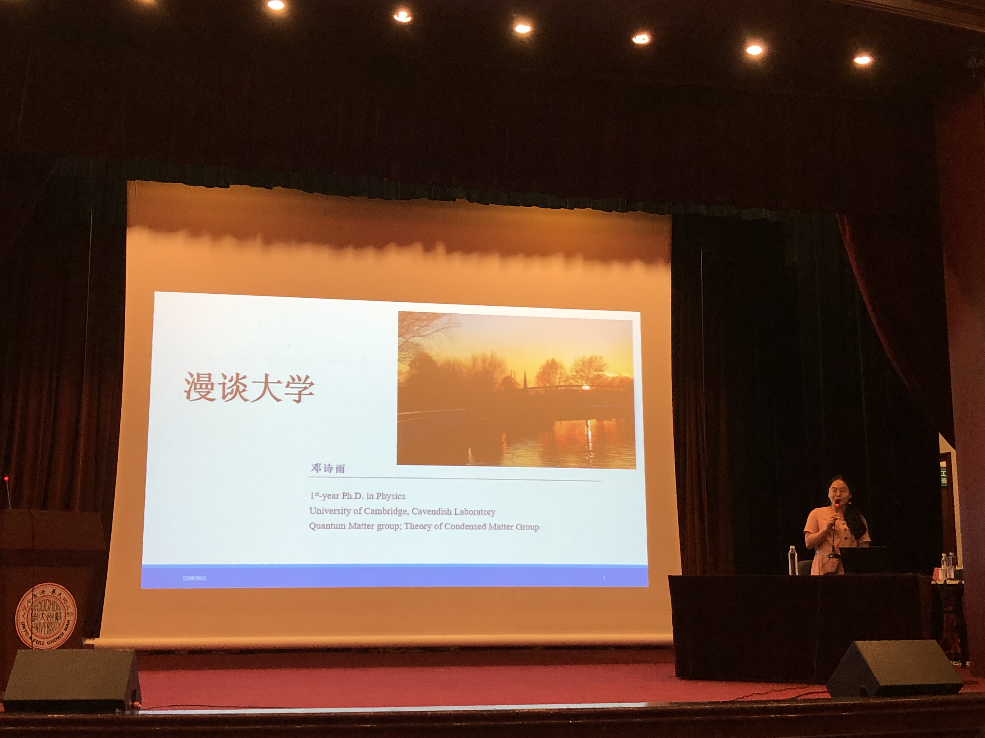 “有爱那山高月小的,便往这里来;有爱那皓月清波的,便往那里去。”第二位主讲嘉宾邓诗雨用红楼梦中的一段话引入了她“漫谈大学”的主题。邓诗雨本科毕业于吉林大学,硕士就读与ETH苏黎世理工大学,目前在英国剑桥大学攻读物理学博士学位。她从课程学习、技能培训、能力训练三方面为我们介绍了她的学习经验。同时她建议同学们要找到自己感兴趣的事情,走出自己的舒适圈,面对问题找好切入点后一步一步地去解决。