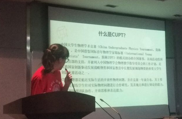 中国大学生物理学术竞赛(CUPT)是物理科学与技术学院全面引入STEAM教育的前行军,更是全力推广的有力抓手。CUPT华东地区赛的成绩更体现了苏州大学物理学人才培养的成果。为了与更多的同学们分享CUPT赛事的收获,也为了进一步推广CUPT理念在同学们中的影响力,由本届CUPT华东区赛的参赛学生自发组织了一场CUPT成果汇报会,于2018年6月14日,在物理科技楼101室举行。17级物理科学与技术学院全体同学参加,学院党委书记孙德芬及相关指导教师应邀出席。汇报会由16级物师班居露同学主持。