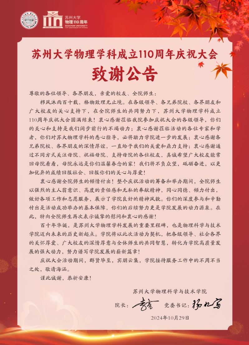 苏州大学物理学科成立110周年庆祝大会致谢公告
