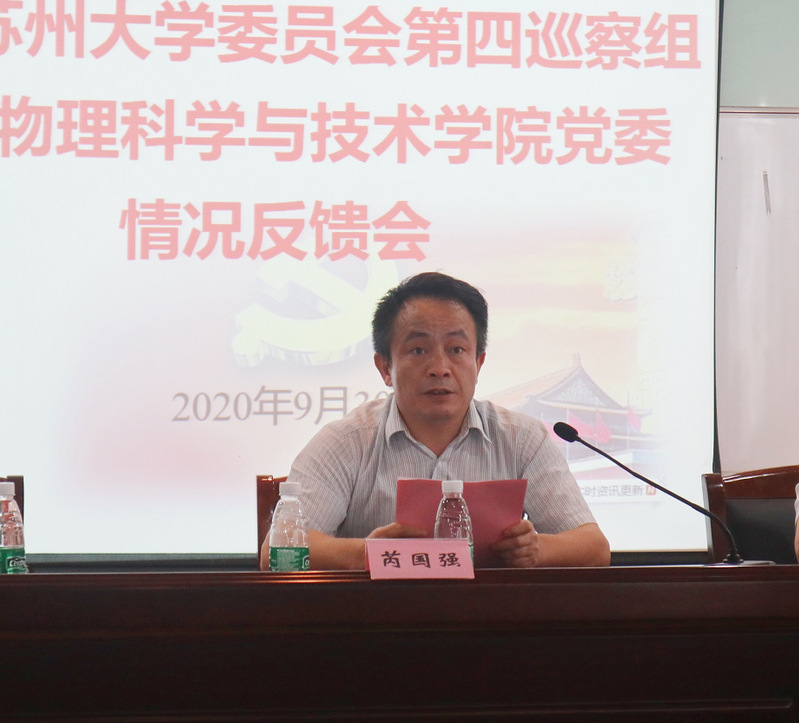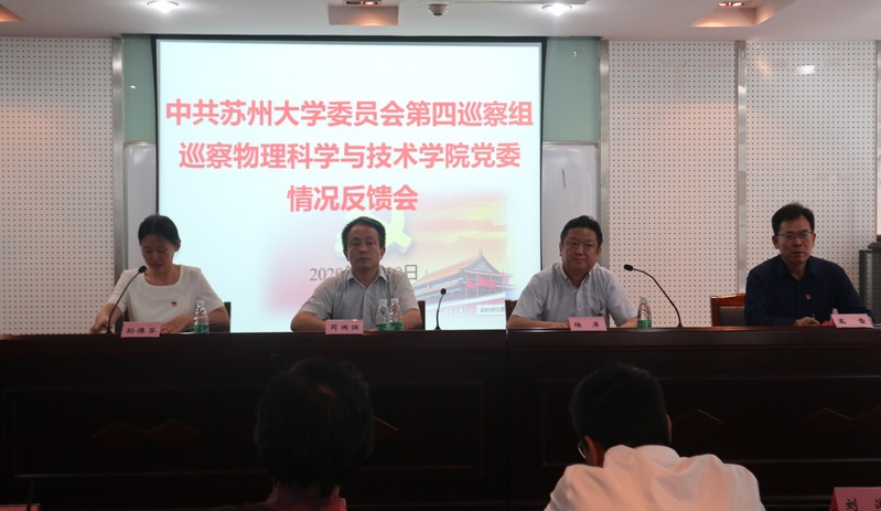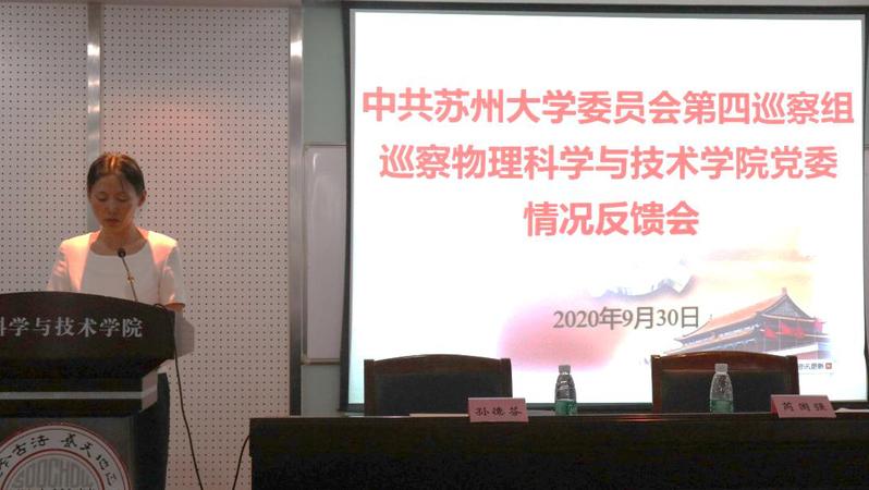 根据学校党委统一部署,2020年9月30日下午,中共苏州大学委员会第四巡察组巡察物理科学与技术学院党委情况反馈会议在物理科技楼409会议室召开。校党委巡察工作领导小组副组长、校党委第四巡察组组长、校党委常委、纪委书记芮国强,巡察组副组长、音乐学院党委书记陆岸及巡察组其他成员,学院全体党政领导成员、全体教职工、学生党支部书记参加会议。反馈会议由学院党委书记孙德芬主持。