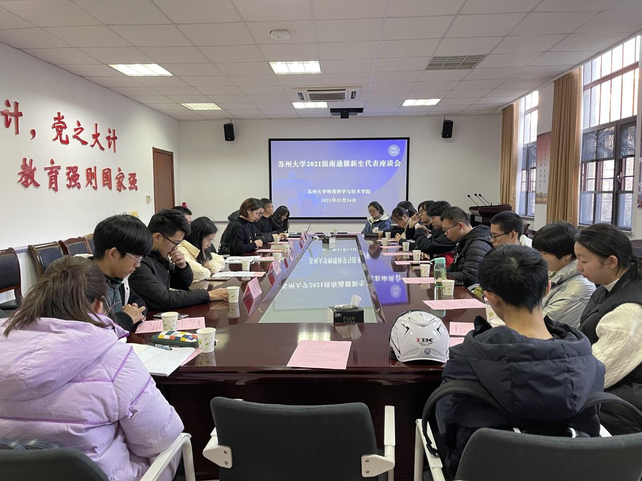 2021年11月24日下午4:00,苏州大学2021级南通籍新生代表座谈会在本部博习楼221会议室顺利召开,本次会议由物理科学与技术学院承办。参加本次座谈会的有学校招生就业处周霖老师、物理科学与技术学院党委副书记谢燕兰老师、“苏小招”招生宣传志愿者协会学生代表、南通籍优秀学长学姐代表、参加寒假回访高中母校活动的学生代表以及2021级各学院南通籍学生代表。会议由物理科学与技术学院辅导员郭永坤主持。