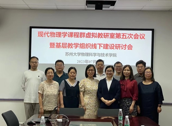 2023年7月10日,现代物理学课程群虚拟教研室线下教研活动在苏州大学物理科学与技术学院博习楼221举行。来自苏州大学、苏州科技大学、南京航空航天大学、苏州城市学院等4所高校的12位虚拟教研室成员参加了本次线下教研活动。