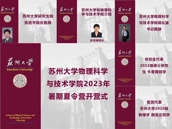 仪式伊始, 研究生院张进平院长向踊跃参与暑期夏令营的全国各地的营员表示热烈欢迎,并向营员们介绍了我校研究生教育教学概况、人才培养理念以及学科特色及建设等情况,并鼓励营员们借助本次夏令营活动,为未来的学习和发展明确方向、希望大家能够在这次活动中有所收获。吴雪梅院长就我院的历史沿革、科研平台、师资队伍、人才培养与教学、社会服务等做了全面介绍,并诚挚邀请同学们来物理科学与技术学院交流和学习。我院2022级硕士研究生牛菁菁、2020级本科生顾浩正同学以学生视角分别从学风建设、奖助政策、实验科研及课余生活等方面向营员介绍了自己在读期间的学习、科研及生活经历,分享了个人的成长、收获,增进了营员对物理学院的了解。最后,杨礼富书记至欢迎辞,他表示苏州得天独厚的人文地理优势和自身办学条件优势为培养优秀的创新型人才创造了有利条件,并鼓励各位营员能够尽早确定自己的研究兴趣和目标,通过本次夏令营丰富多彩的活动,能够选择苏大、爱上物理,并祝愿本次夏令营活动圆满成功。