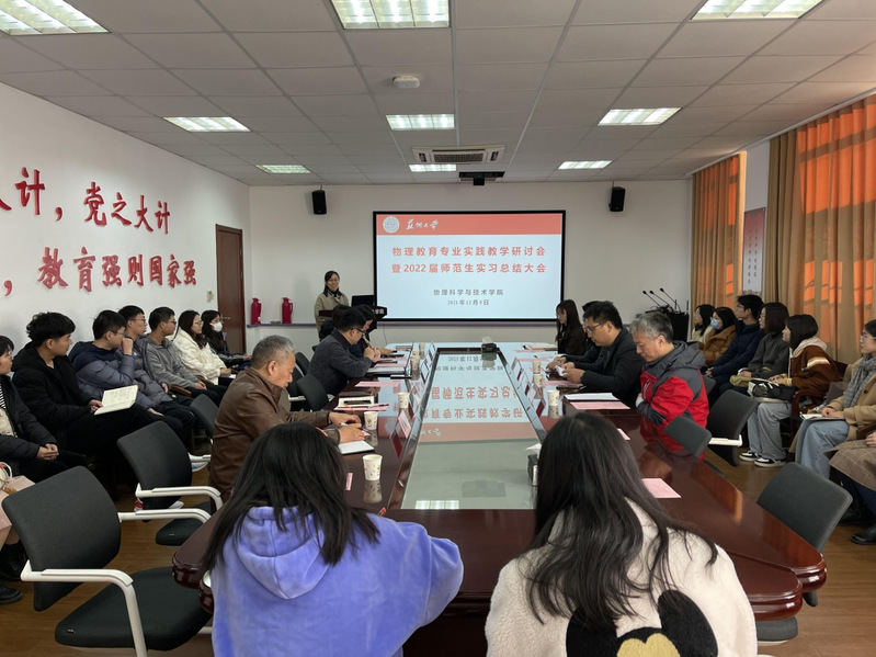 12月5日上午9点,物理教育专业实践教学研讨会暨2022届师范生实习总结大会在博习楼221隆重举行。苏州市教育科学研究院物理教研员李刚,苏州实验中学副校长马朱林,苏州第一中学高级教师李兴,物理科学与技术学院院长吴雪梅,副院长周丽萍、杭志宏,物理教育研究所所长袁海泉、副所长桑芝芳,实习指导老师陈航燕,毕业班辅导员郭永坤以及2022届物理教育实习生参加本次会议。会议由学院副院长周丽萍主持。
