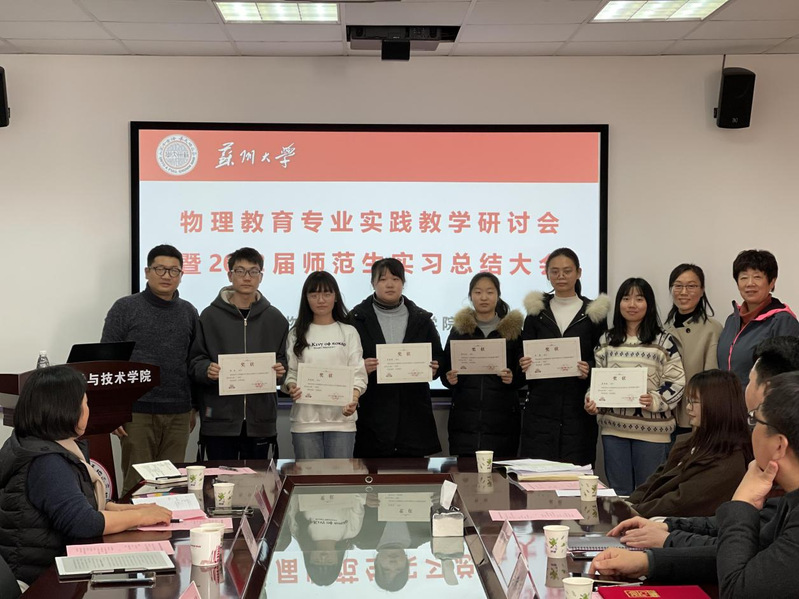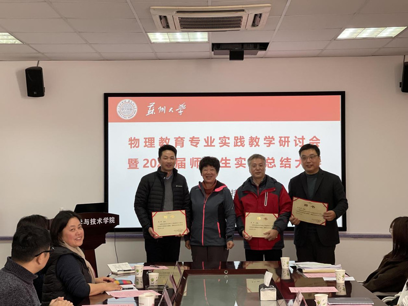 会议最后,吴雪梅院长为校外兼职指导教师颁发聘书并给学院师范生技能大赛获奖的同学颁发荣誉证书。吴雪梅院长在总结发言中表示,每一位参与教育实习的同学,均代表苏州大学物理科学与技术学院的形象,实习的成效对学院物理学科的发展和师范专业的建设起着关键的促进作用,学院2022届教育实习圆满结束,离不开各实习中学和指导老师的支持和付出,再次向各指导单位和指导老师表示感谢。