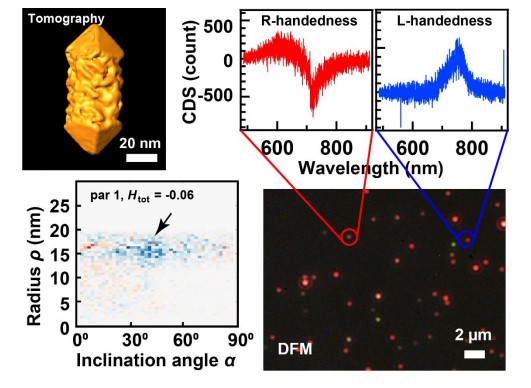 本研究工作首次提出:在没有任何手性配体参与的情况下,在金银共沉积的过程中形成的金银界面上,可以自发地形成手性结构;通过电子显微和单颗粒圆差分散射表征,证实了结构的手性特征。该项工作首先进行了金纳米棒的合成,接着在金纳米棒表面,金和银以特定的比例发生共沉积,产生相分离,形成金银界面,最后通过氧化去除银的方法得到螺旋结构。本工作通过高角环形暗场扫描透射电子显微镜和电镜断层三维重构技术,观察到金银合金的壳层中存在相分离以及金银界面的螺旋结构,同时观察到在氧化后金棒的侧面出现清晰螺旋结构,对表面螺旋结构的螺旋度进行了测算,得到了螺旋度分布图。采用单颗粒圆差分散射光谱的方法对单个螺旋金纳米棒的光学响应进行了检测。电镜断层三维重构测试和单颗粒圆差分散射光谱检测的结果表明螺旋纳米棒的手性是相对随机的,但是单个螺旋金纳米棒表现出较强的左手或右手的手性特征。研究表明,在金银共沉积的过程中产生了对称性破缺,这种在金银分相界面上的初始扰动最终演化成为纳米晶表面的手性结构。