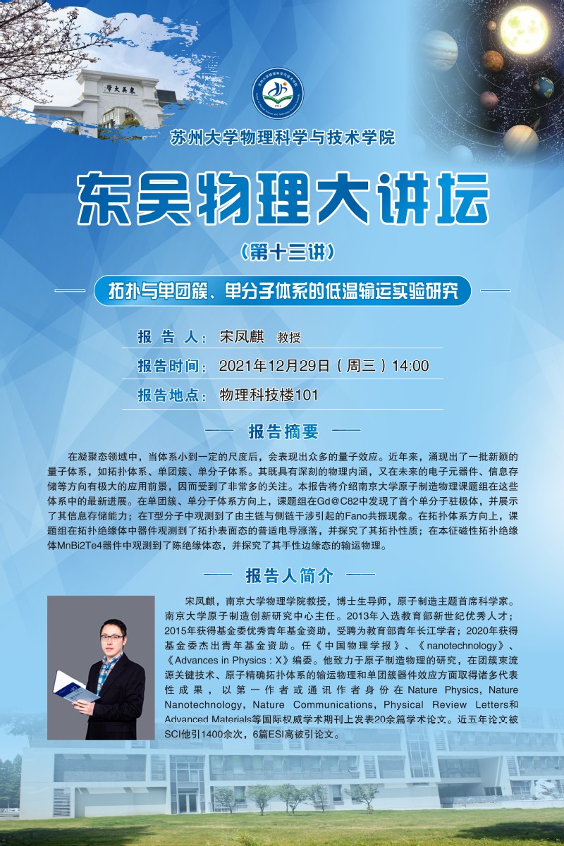 “东吴物理大讲坛“(第十三讲)-拓扑与单团簇、单分子体系的低温输运实验研究