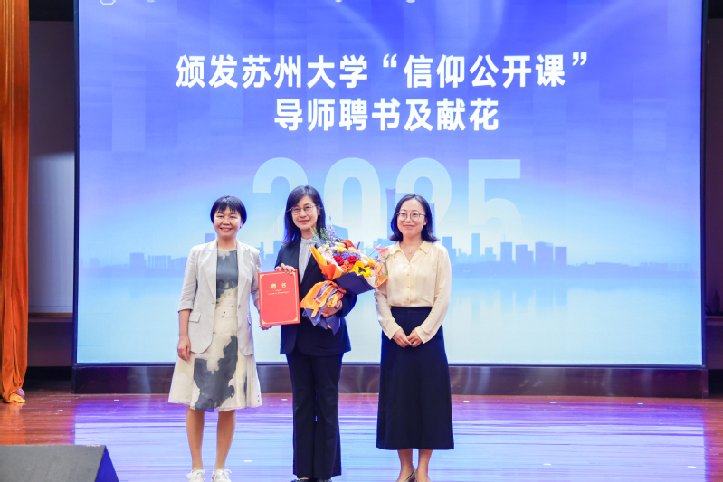 校党委教师工作部部长林萍和团委副书记徐娜为黄峻博士颁发苏州大学“信仰公开课”导师聘书并献花。