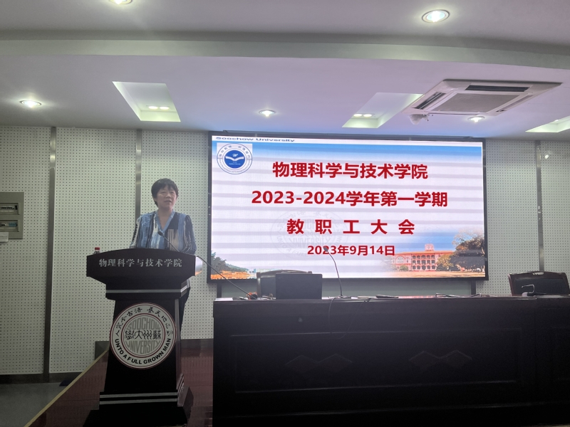 吴雪梅院长向学院全体教师传达了全校干部大会的会议精神,结合会议精神以及《苏州大学2023年工作要点(补充部分)》,从推进党建工作、加强思想政治工作、深化全面从严治党、健全人才培养体系、提高人才工作质量、深入推进学科建设、夯实科研创新根基、加大开放办学力度、优化内部资源配置、强化安全保障能力十个方面,布置了学院2023年下半年重点工作,如本科教学审核评估工作、物理学人才培养机制改革等。同时吴雪梅院长强调要进一步加强师生学术诚信教育,学院全体师生进行科学研究时一定要将“诚信”二字作为根本立足点,坚持学术诚信,恪守学术规范。