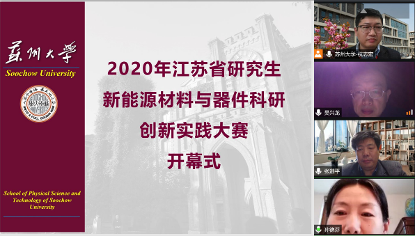 由江苏省学位办委托江苏省理学1类研究生教育指导委员会主办,江苏省教育厅专项资助,苏州大学物理科学与技术学院承办的2020年江苏省研究生新能源材料与器件科研创新实践大赛,于2020年11月20日-22日苏州大学天赐庄校区召开。