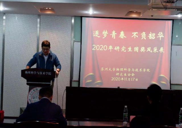 为坚决贯彻落实党的十九届五中全会精神和全国研究生教育会议精神,持续加强我院研究生学风建设,充分发挥国奖获得者青春榜样力量,营造良好学术研究氛围,提升研究生科研创新能力,物理科学与技术学院研究生分会于11月17日下午在物理科技楼409会议室举办了“逐梦青春,不负韶华”2020年研究生国奖风采展。出席此次活动的有苏州大学研究生院院长曹健、物理科学与技术学院院长高雷、党委书记孙德芬、副院长杭志宏和学院全体20级研究生。曹院长在高雷院长和孙书记的陪同下参观了2020年研究生国家奖学金风采展展板,并就学院的发展进行了深入的交流。本次活动由刘晓佳主持。