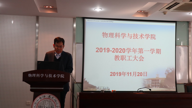 孙德芬书记就党建和思想政治建设方面的工作向全院教师做了通报。本学期完成的工作主要包括组织师生参加庆祝新中国成立70周年大合唱比赛获得三等奖、开展“不忘初心、牢记使命”主题教育、落实江苏高校党支部“提质增效”三年行动计划工作、大学物理党支部申报省级样板支部工作、顺利完成研究生奖学金评审工作以及在2019级本科生中实行全员导师制等。孙书记同时强调了安全工作的重要性,希望学院全体教师时刻不要放松安全的弦。最后,孙书记带领全体教职工学习了党的十九届四中全会精神。