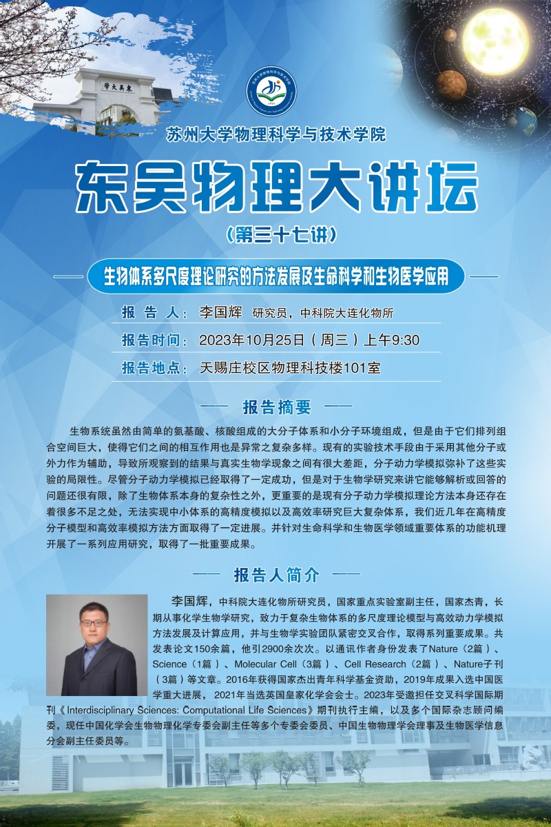 “东吴物理大讲坛“(第三十七讲)——生物体系多尺度理论研究的方法发展及生命科学和生物医学应用