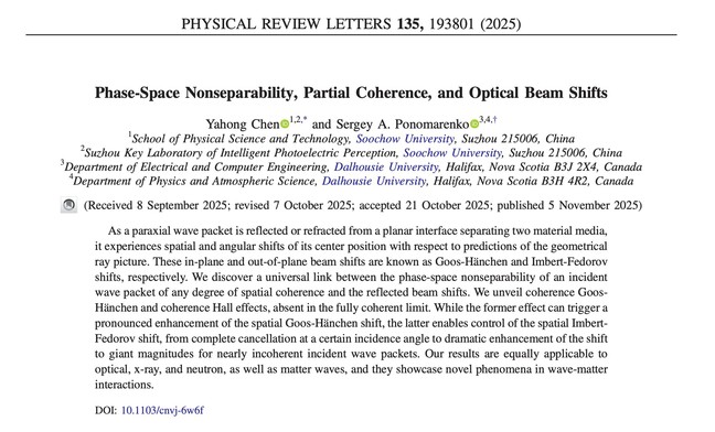 论文信息:Yahong Chen and Sergey A. Ponomarenko, Phase-space nonseparability, partial coherence, and optical beam shifts, Physical Review Letters 135, 193801 (2025).