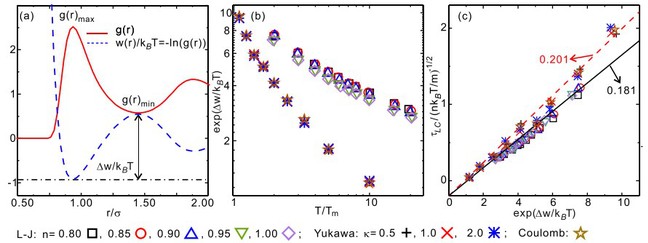 更令人兴奋的是,团队成功地从液体最基本的静态结构,径向分布函数g(r)中,提取出决定系统局域连通寿命而需要克服的势垒信息。研究结果显示,二维简单液体的\tau_{LC}仅由径向分布函数g(r)的第一个峰和第一个谷的高度差所决定,即系统局域连通寿命等于高温极限类气体状态的局域连通寿命,再乘以径向分布函数第一个峰和第一个谷高度之比。将该结果代入Frenkel的液体描述中,最终解析推导出了二维液体剪切黏度和系统原子排布结构之间的关联,如图3所示,即黏度等于高温极限类气体状态黏度再乘以径向分布函数第一个峰和第一个谷高度之比,该结果意味着可以通过液体系统的原子排布结构来准确预测其剪切黏度。