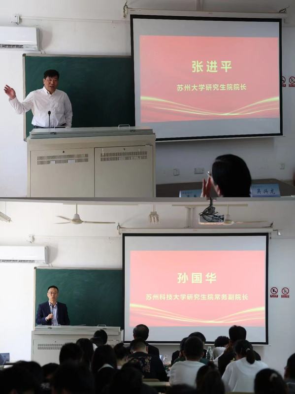江苏省理学Ⅰ类研究生教育指导委员会副主任吴兴龙教授、委员薛怀国教授,以及省内10多所高校校领导、院领导等评审专家,江苏省材料学会秘书长强星教授,苏州科技大学党委常委、副校长李勇,研究生院常务副院长孙国华,苏州科技大学物理科学与技术学院院长马春兰、副院长郝翔、苏州大学物理科学与技术学院副院长杭志宏以及来自武汉大学、南京大学、东南大学等多所省内外高校的136位研究生参加开幕式。