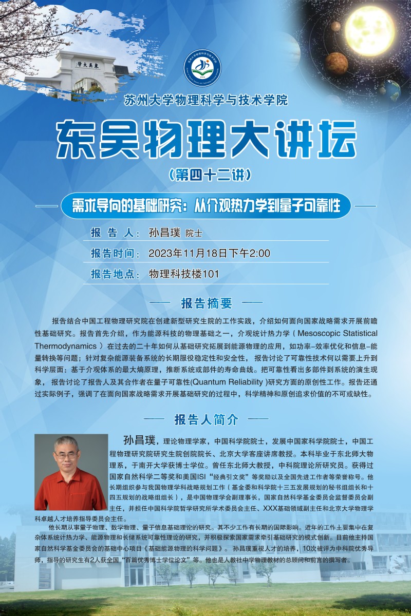 “东吴物理大讲坛“(第四十二讲)——需求导向的基础研究:从介观热力学到量子可靠性