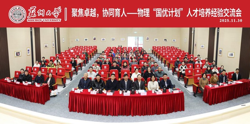 11月29日至30日,由苏州大学研究生院主办,我院承办的“聚焦卓越,协同育人——物理‘国优计划’人才培养经验交流会”在天赐庄校区成功举行。会议旨在总结培养经验、剖析现实问题、凝聚协作共识、共绘发展蓝图。苏州大学研究生院院长张进平,华东师范大学物理与电子科学学院潘苏东教授,我院党委书记赵承良,副院长杭志宏、周丽萍,以及“国优计划”校内外导师、研究生等七十余人参会,共商培养路径,共享育人智慧。