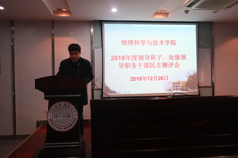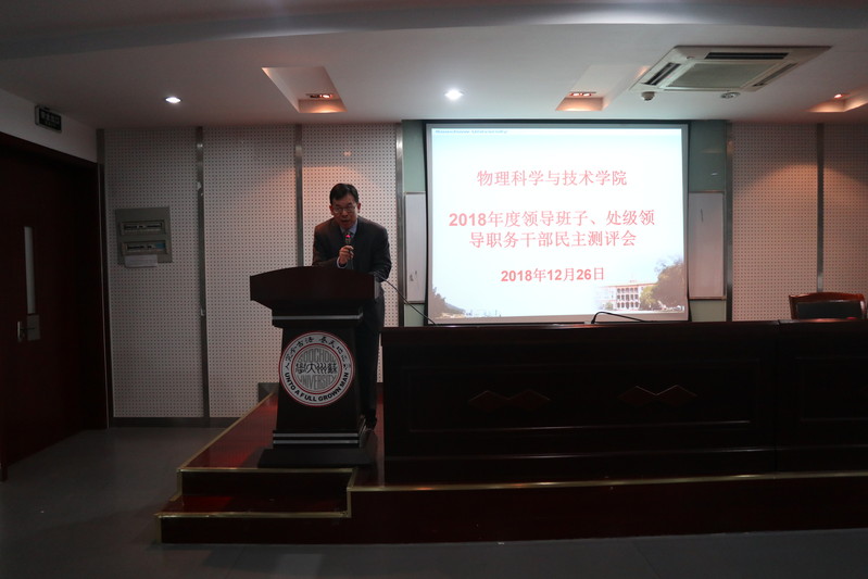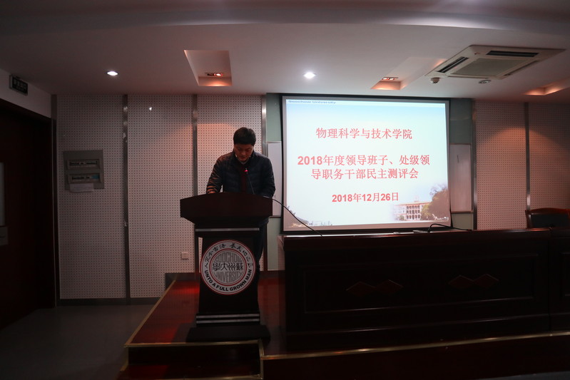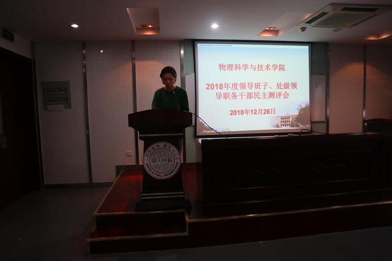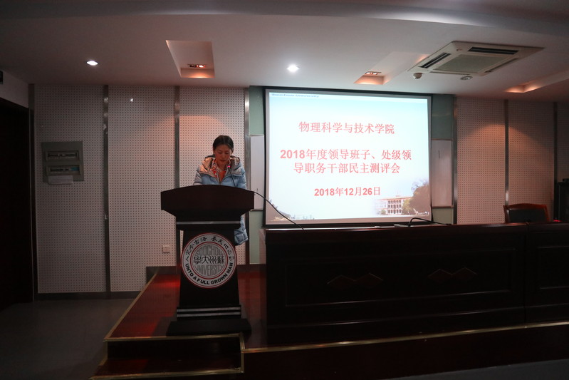 12月26日下午,物理学院在物理科技楼409会议室,召开了处级领导班子和领导干部2018年度民主测评会。会议主要分为三个议程,首先是学院领导班子作年终工作总结,领导干部个人进行述职述德述责述廉;其次是全体教职工对学院领导班子及领导干部个人进行民主测评;最后由学院领导进行期末工作安排。会议由孙德芬书记主持。