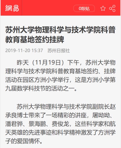 作为苏州大学科学家精神教育基地集群参建单位之一,下一步,我院将继续依托专业优势,推进面向苏州市的科学家精神弘扬教育工作,以“两弹一艇”“大手拉小手科学零距离”为品牌,深入挖掘老科学家的素材,从科学家精神宣讲、物理学相关课程思政等方面扎实开展相关活动,实现党建引领、科学精神普及和人才培养的有机融合,为弘扬科学家精神、提高人才培养质量作出应有的贡献。