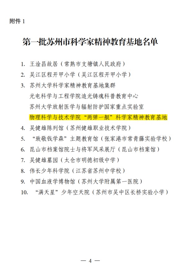 近日,首批苏州市科学家精神教育基地名单公布,苏州大学科学家精神教育基地集群成为全市首批10家建设单位。我院“两弹一艇”科学家精神教育基地作为苏州大学科学家精神教育基地集群的三家单位之一成功入选。
