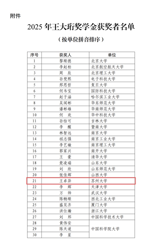 近日,中国光学学会2025年王大珩奖学金(原王大珩光学奖学生奖)评选结果揭晓。中国光学学会先后组织通讯评审和会议评审,经无记名投票,最终评选出 2025 年王大珩奖学金获奖者 30 名,我院2022级博士研究生王卓异(导师:赵承良教授)荣获该奖。