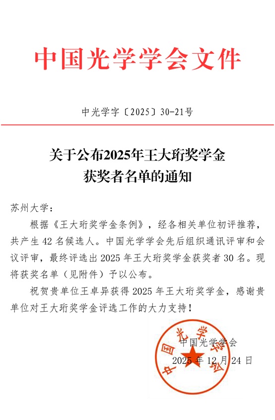 此次获奖,既是对王卓异科研能力与学术潜力的充分肯定,也彰显了我院在光学领域人才培养与科学研究方面的综合实力。