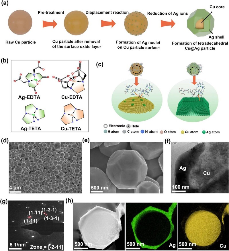针对这些问题,近日我院邹帅副研究员-苏晓东教授课题组提出通过制备一种具有大银壳晶粒的新型十四面体银包铜粉来提高异质结电池低温导电浆料用银包铜粉的长期可靠性和导电性。具体地讲,银包铜粉的银壳是由银纳米晶组成,这些纳米晶之间的晶界会引发去润湿现象,并可作为氧气从银壳进入铜核的通道,减少银壳的晶界可以提高银包铜粉的热稳定性和抗氧化性,相同面积下增加银壳晶粒尺寸等同于减小晶界。络合剂的选择是银包铜粉制备的关键,它即决定了镀液的稳定性,又决定了银镀层的性质。多数研究都使用氨水作为制备银包铜粉的银离子络合剂,但银氨络离子不稳定,一旦镀液发生自分解后制备的银包铜粉表面会非常粗糙。在该工作中,研究人员使用三乙烯四胺(TETA)和乙二胺四乙酸二钠(EDTA·2Na)作为复合络合剂,TETA用于抑制银离子水解,EDTA·2Na用于提高银离子的沉积速率获得光滑致密的银壳。在优化TETA、EDTA·2Na的用量和调整银溶液的滴加速率后,可获得具有大银壳晶粒的十四面体银包铜粉。该十四面体银包铜粉具有优异的热稳定性和抗氧化性,在空气中250℃热处理30 min未氧化且未出现银壳脱湿现象,且在空气中进行200 h湿热实验(80℃,80% r.h.)以及常温放置3个月均为发生氧化。另外,实验和模拟结果都表明,由于更大的颗粒间接触面积,该十四面体银包铜粉的导电性优于传统的球形银包铜粉。