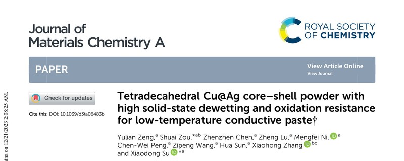 上述工作以“Tetradecahedral Cu@Ag core–shell powder with high solid-state dewetting and oxidation resistance for low-temperature conductive paste”为题发表在期刊《Journal of Materials Chemistry A》(IF = 11.9/Q1)上。苏州大学物理科学与技术学院博士生曾玉莲为论文的第一作者,物理科学与技术学院苏晓东教授、邹帅副研究员为论文的共同通讯作者。论文中的模拟工作得到了物理科学与技术学院孙华副教授的指导和帮助。本工作得到了国家自然科学基金、中国博士后科学基金、江苏省高等学校自然科学基金、苏州市科技计划项目、江苏省高校优势学科项目的支持。