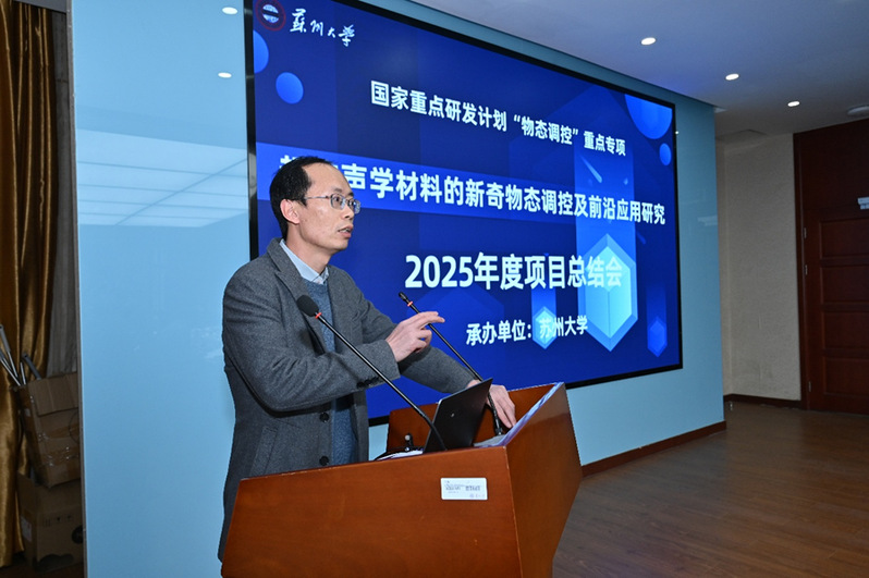 2026年1月17日至18日,国家重点研发计划“物态调控”专项项目“超构声学材料的新奇物态调控及前沿应用研究”(编号:2022YFA1404400)2025年度总结会在苏州大学独墅湖校区成功举办。该项目由苏州大学作为牵头承担单位,由我院蒋建华教授主持。