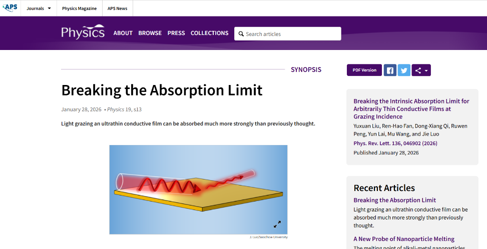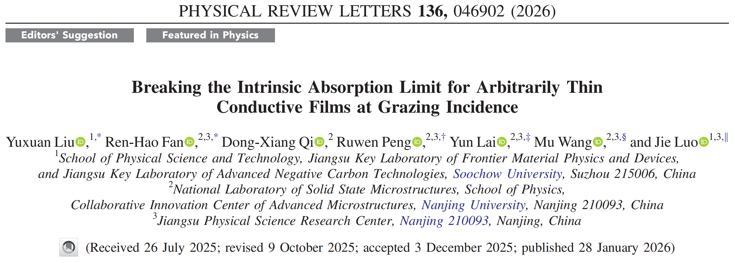 相关研究成果以“Breaking the Intrinsic Absorption Limit for Arbitrarily Thin Conductive Films at Grazing Incidence”为题,在线发表于《物理评论快报》(Phys. Rev. Lett. 136, 046902 (2026)),并被选为“编辑推荐”(Editors’ Suggestion)以及被Physics亮点评论(Featured in Physics)。苏州大学罗杰研究员、南京大学彭茹雯教授、王牧教授、赖耘教授为通讯作者;苏州大学研究生刘宇轩与南京大学范仁浩副教授为共同第一作者。