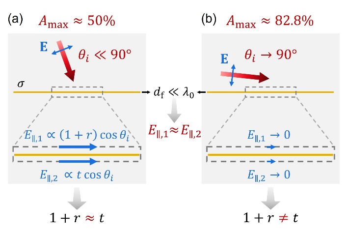 传统电磁与光学理论认为,在对称环境中,任意薄均匀、非磁性导电薄膜的吸收率存在50%的电磁波吸收上限,这源于切向电场连续性的约束,这要求反射系数r与透射系数t满足约束条件:,该条件具有普适性,与频率和入射角无关,因此,通常认为一张任意薄非磁性导电薄膜的本征吸收极限即为50%。然而,本研究通过严格的解析推导与数值计算发现,当入射角趋近90°时,尽管薄膜上下界面上的切向电场仍保持近似连续,但其幅值因而趋于零,这使得约束条件自然失效,从而为突破50%吸收极限提供了可能性。