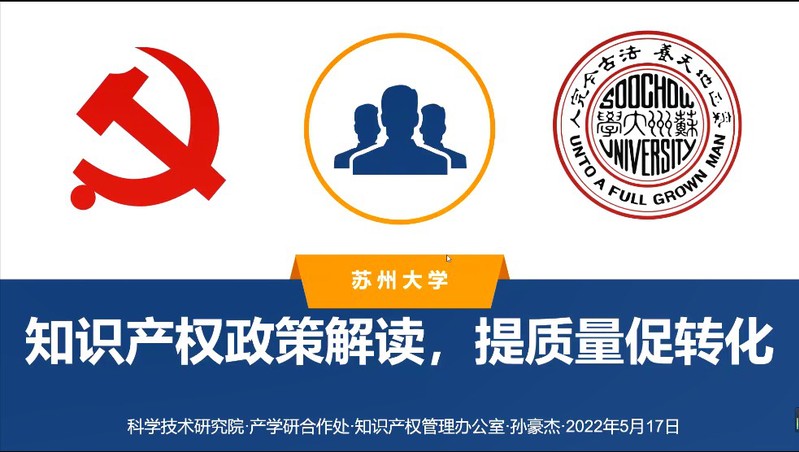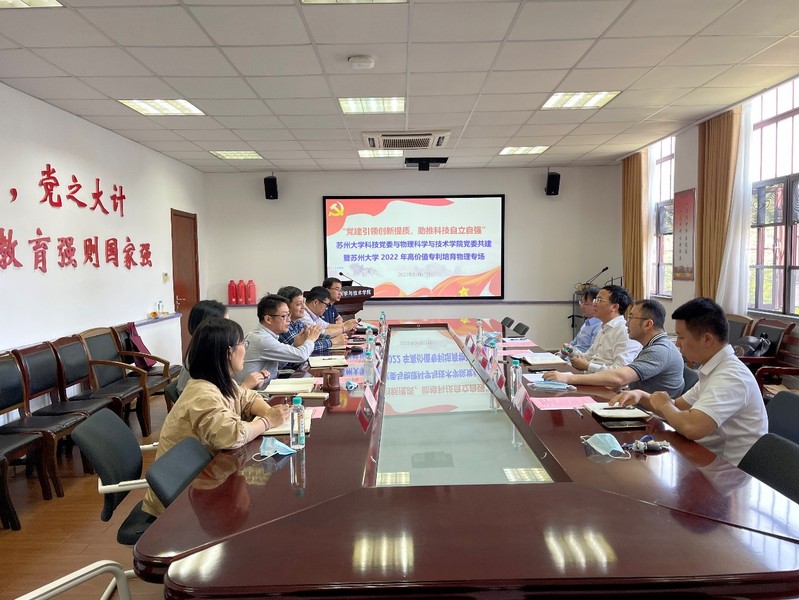 为更好提高学院老师和同学专利申请书的撰写质量、知识产权保护、科技成果转化等方面的工作。2022年5月17日下午,校科技党委和物理科学与技术学院党委联合举办主题为“党建引领创新提质,助推科技自立自强”的联合党建活动暨苏州大学2022年高价值专利培育物理专场活动。科技党委产学研合作处党支部全体人员、物理科学与技术学院党委全体人员、苏州市知识产权保护中心专家、苏州市中南伟业知识产权代理事务所知识产权专家及物理学院老师和研究生参加此次活动。活动通过线上和线下的方式开展,线下会场设在苏州大学本部博习楼221会议室,会议由校科学技术研究院产学研合作处田天副处长主持。
