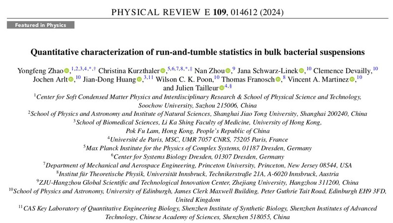 该工作涉及活性物质理论、光学实验和合成生物学三个不同领域的深入合作,展示了跨学科研究的重要性。马克斯普朗克研究所课题组组长Christina Kurzthaler博士,浙江大学周楠研究员,爱丁堡大学Jana Schwarz-Linek博士、Clemence Devailly博士、Jochen Arlt博士,香港大学黄建东教授,爱丁堡大学Wilson C. K. Poon教授,因斯布鲁克大学Thomas Franosch教授,麻省理工学院Julien Tailleur副教授,爱丁堡大学Vincent Martinez博士均参与了该工作。其中Christina Kurzthaler与赵永峰主要承担了该技术的理论构建与数据分析,Vincent Martinez与Jana Schwarz-Linek主要承担了细菌培养与显微成像实验,周楠在工程菌构建和定量表征中作出了重要贡献。该工作受到了深圳市孔雀计划与国家重点研发计划的支持。