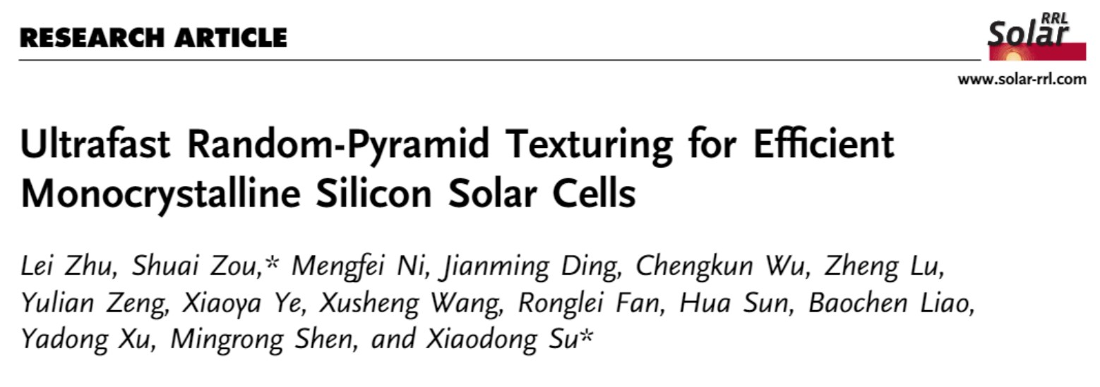 近日,国际能源类知名学术杂志Solar RRL和ACS Applied Energy Materials报道了学院邹帅助理研究员(共同通讯作者)/苏晓东教授(共同通讯作者)在高效单晶太阳电池表界面微结构构筑方面取得的研究成果,题目分别为“Ultrafast Random-pyramid texturing for efficient monocrystalline silicon solar cells”和“Improvement of Light Trapping in Bifacial PERC Silicon Solar Cells by Optimizing the Rear Surface Morphology”。