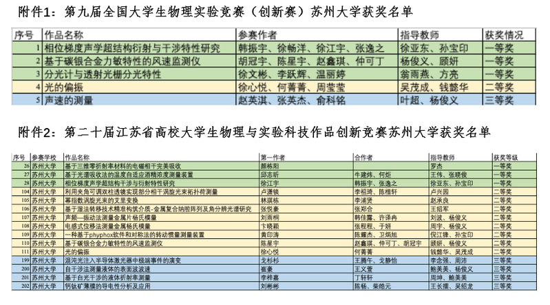 此外,在11月10日至12日第二十届江苏省高校大学生物理与实验科技作品创新竞赛中,我校学子亦取得佳绩,共斩获一等奖3项,二等奖8项,三等奖4项,优秀奖5项,15位老师被评为优秀指导教师,苏州大学获得竞赛优秀组织奖。本次竞赛由江苏省物理学会、江苏省高校大学生物理与实验创新竞赛组织委员会主办,淮阴师范学院承办,全省共有44所高校参赛,参赛项目398项,其中论文类72项,实验类326项,为省级高水平物理赛事。通过现场操作、选手答辩等环节,大赛共评出一等奖37项,二等奖86项,三等奖101项。