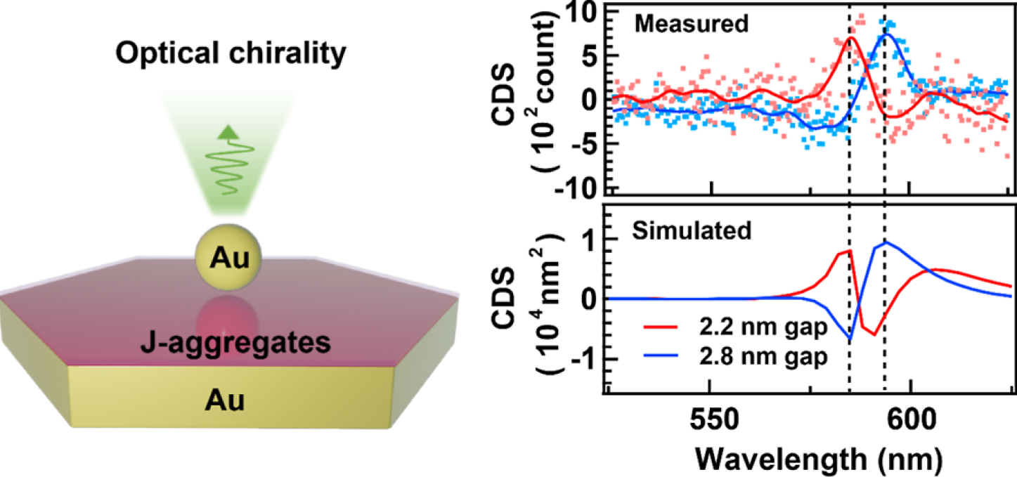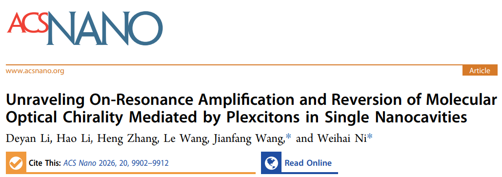 近日,倪卫海教授课题组和香港中文大学王建方教授合作进行了等离激元纳腔分子光学手性的放大与反转机制研究。该研究成果以苏州大学物理科学与技术学院硕士研究生李德妍为第一作者、以苏州大学物理科学与技术学院江苏省前沿材料物理与器件重点实验室为第一单位、以“Unraveling On-Resonance Amplification and Reversion of Molecular Optical Chirality Mediated by Plexcitons in Single Nanocavities”为题发表在ACS Nano(影响因子IF=16.1)。