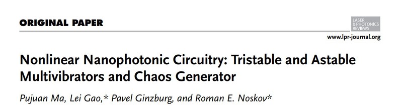 2020年2月,苏州大学物理科学与技术学院高雷研究员团队,与特拉维夫大学电气工程系Pavel Ginzburg教授团队合作,提出了一种新型非线性等离激元石墨烯二聚体纳米天线,通过二聚体颗粒的等效集总电路,可以设计三稳态多谐振荡器、非稳态多谐振荡器以及混沌发生器等。相关研究工作以苏州大学为第一单位,发表于《Laser & Photonics Reviews》,并被选为封面文章。论文题目为:Nonlinear Nanophotonic Circuitry: Tristable anRd Astable Multivibrators and Chaos Generator。该研究扩展了“超电子学”的范例,将非线性动力学模态引入到与光学纳米天线相关联的纳米光子器件中,有助于开发具有可调节性非线性动力学响应的新一代纳米光子器件。