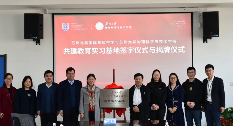 2021年3月25日下午,苏州大学物理科学与技术学院与苏州北美国际高中共建教育实习基地签约与揭牌仪式在苏州北美国际高中成功举行。出席本次活动的有苏州北美总校执行校长王莹、党支部书记赵加军、副校长吴光宇、教务处主任高宏伟、校办主任王亚文,物理学院高雷院长、孙德芬书记、方亮副院长、物理教育研究所所长桑芝芳、教育实习负责老师周丽萍。活动由赵加军书记主持。