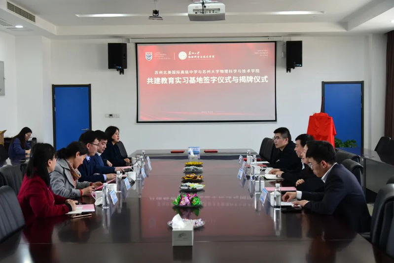 赵加军书记与高雷院长分别在仪式上致辞,随后正式签署了“苏州北美国际高级中学与苏州大学物理科学与技术学院共建教育实习基地协议书”,并揭牌。与会人员进行了愉快的交流,双方表示将会全力协作,密切配合,为社会培养更多高素质人才。