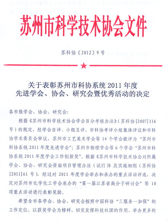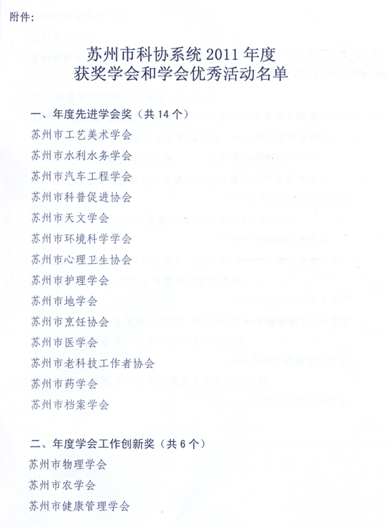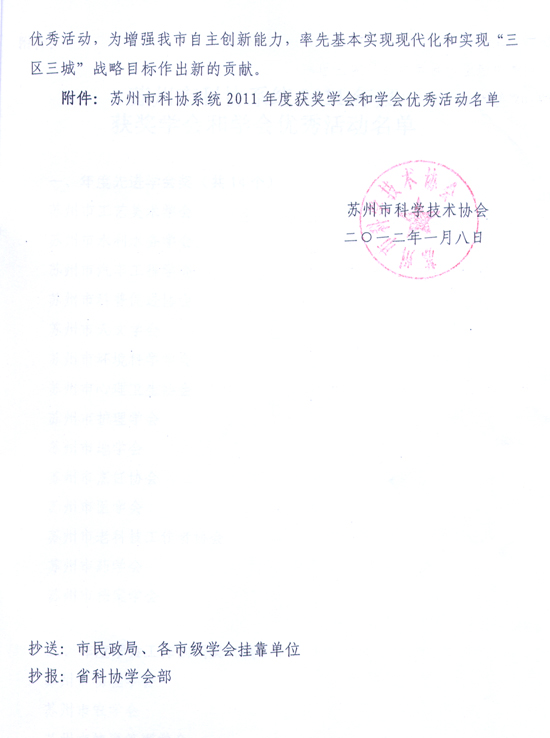 转发《关于表彰苏州市科协系统2011年度先进学会、协会、研究会暨优秀活动的决定》